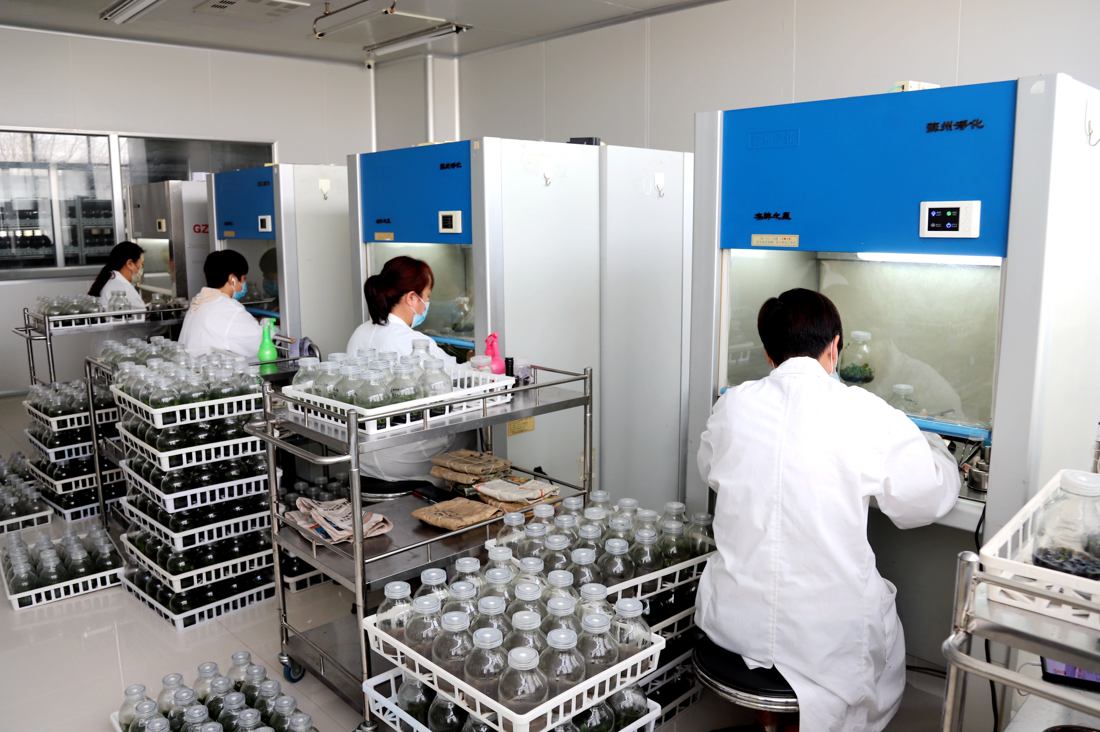 公司組培室現有專業技術人員及操作人員10余名。蝴蝶蘭培育時間久、周期長、技術要求高、受市場影響大,為了應對培育過程中的風險,從2014年開始,博華花卉園藝事業部經過長時間的技術攻堅和市場調研,最終探索出一套適合本公司本區域花卉培育養護的標準及操作規程,使花卉生產養護有理有據可依,大大提升了蝴蝶蘭的組培快繁技術,實現了該項目的高產高效。